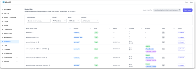 Admin can select models to expose on public model hub -> Users can go to the public url (/ui/model_hub_table) and see available models.